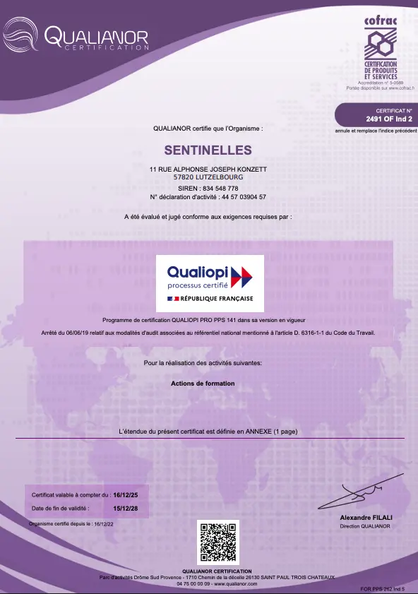 Recyclage de la formation Sauveteur Secouriste du Travail (SST) avant la fin de la validité de la formation (24 mois). Au-delà de cette période, une nouvelle formation initiale sera nécessaire. Validité : 24 mois